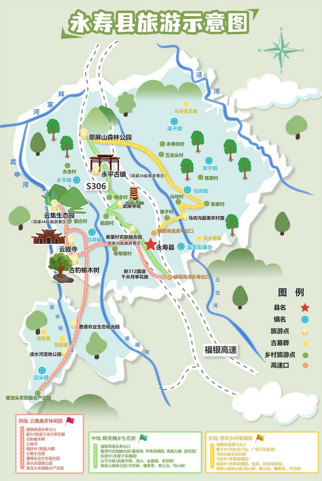 其中,西线“云集康养休闲游”从福银高速永寿出口出发,穿越千米月季长廊,探访1700年古豹榆木树,在云集生态园体验玻璃栈道、林间骑行,最终抵达漆水河湿地公园,感受“天然氧吧”的治愈力。