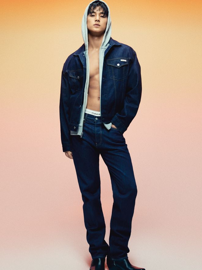 金珉奎用标志性复刻90牛仔夹克、宽松圆领T恤、飞行夹克的不同选择,搭配复刻90系列直筒牛仔裤,最大程度展现了秋季的男装丹宁穿搭,其中作为点缀的全新摩登引力带内裤亮相,更是增添整体视觉效果上的潮流表现力。