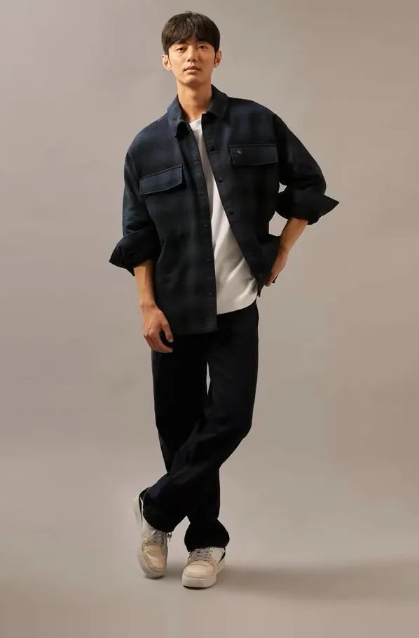 而选择标准直筒牛仔裤时,金珉奎则用宽松丹宁夹克与拉链羊毛连帽衫搭配,让整套OOTD更具酷感;此外,用浅色牛仔衬衫夹克、蓝色修身牛仔衬衫叠穿搭配深色复刻90宽松牛仔裤,在有限的牛仔范围内放大剪裁与版型优势,随性轻松中凸显质感。